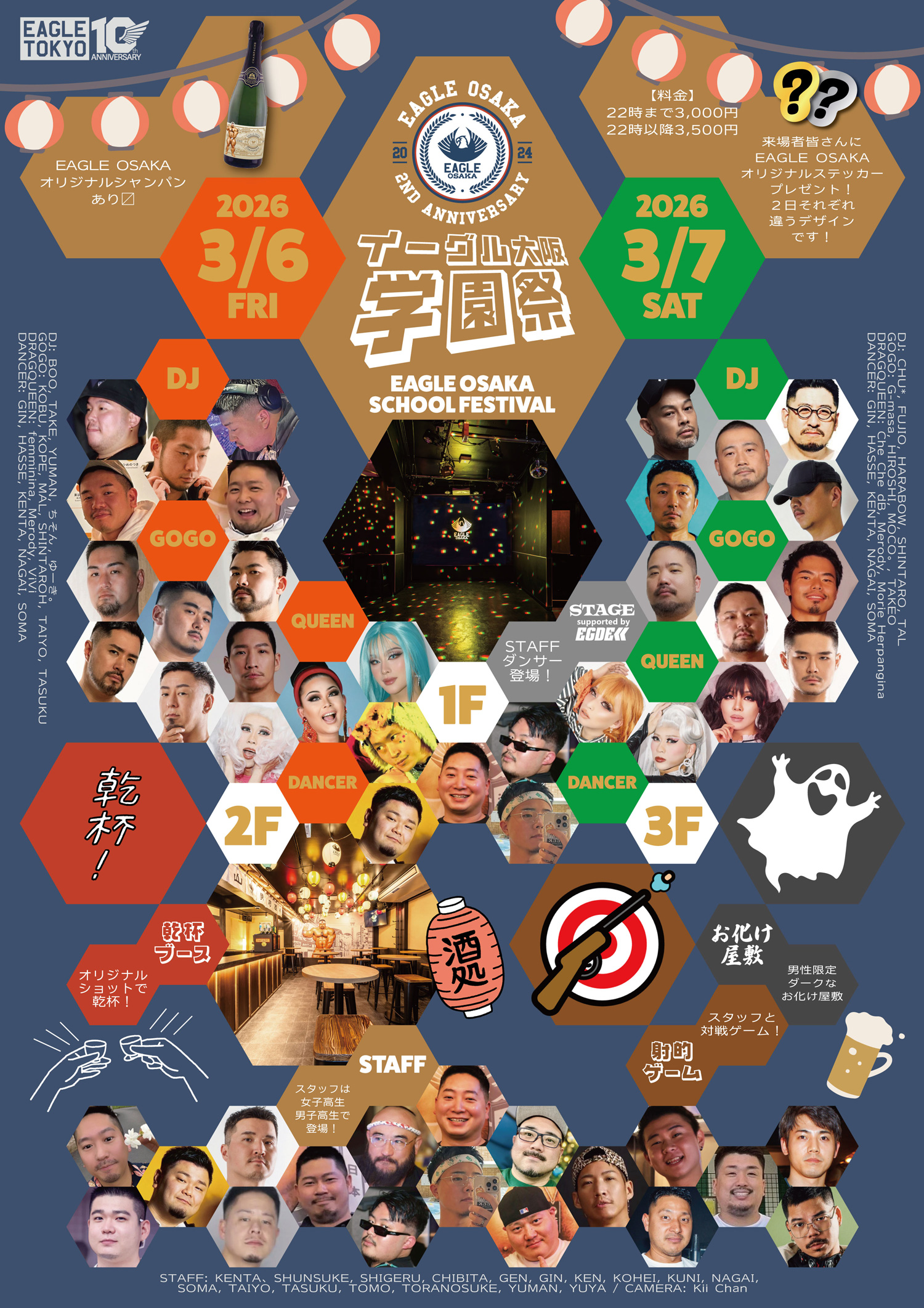 西日本最大のゲイバー「EAGLE OSAKA」2024年3月大阪堂山町にオープン!EAGLE TOKYO GROUP3店舗目となる「EAGLE OSAKA」が西日本最大級のゲイバーとしてオープン。1階は週末にはDJパーティが開催されるダンスフロア、2階は横丁にゲイバーやアパレルショップが軒を連ねています。もちろん人気アーティスト児雷也氏による壁画もあります!